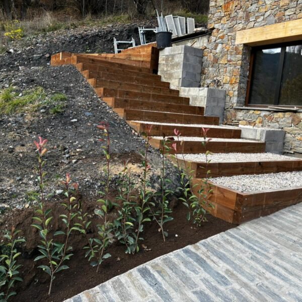 Construcció d’escala amb travesses de fusta per salvar desnivell al jardí